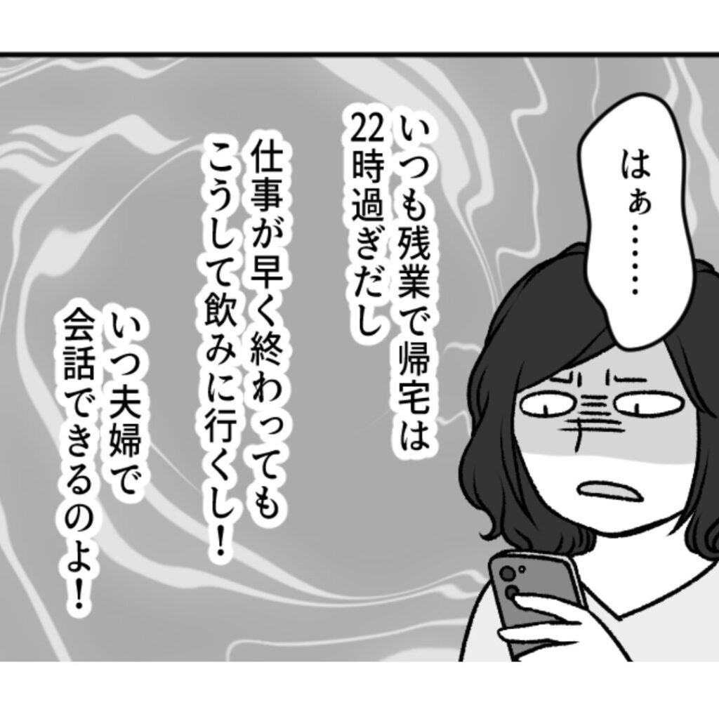 旦那は激務なので22時頃に帰宅することが多く、仕事が早く終わったときや週末は飲みに行くため、