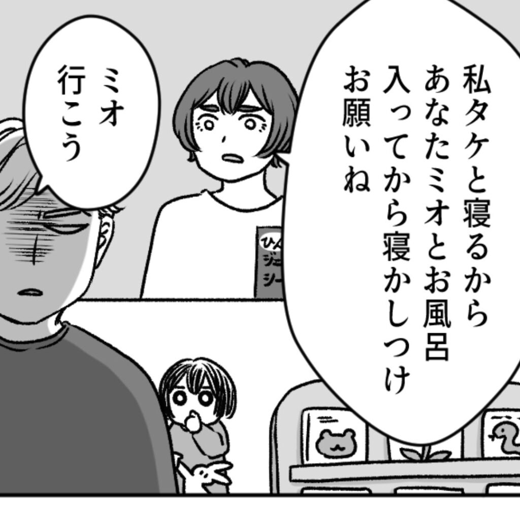 私がタケと同じ部屋で看病をして、旦那にはミオとお風呂に入ってもらって、別の部屋で寝てもらおうと思ったのですが……。